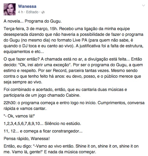 Wanessa Camargo resolveu falar sobre o ocorrido no Programa do Gugu exibido na última terça (03).