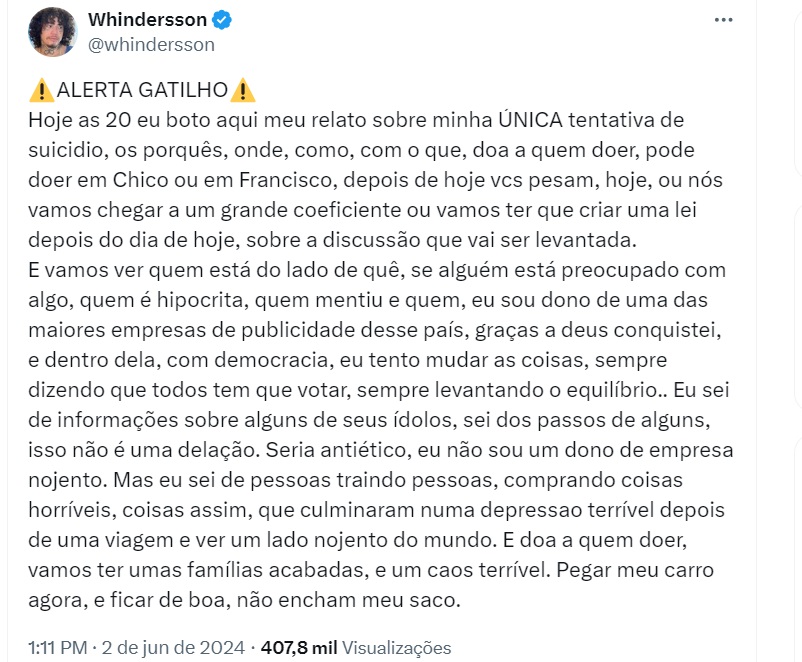 Whindersson Nunes deixou os internautas preocupados ao publicar um texto prometendo divulgar às 20h deste domingo (2) a sua "única tentativa de suicídio", além de contar sobre os motivos "doa a quem doer". Em um post no Twitter, o humorista insinuou, ainda, que vai expor "ídolos".