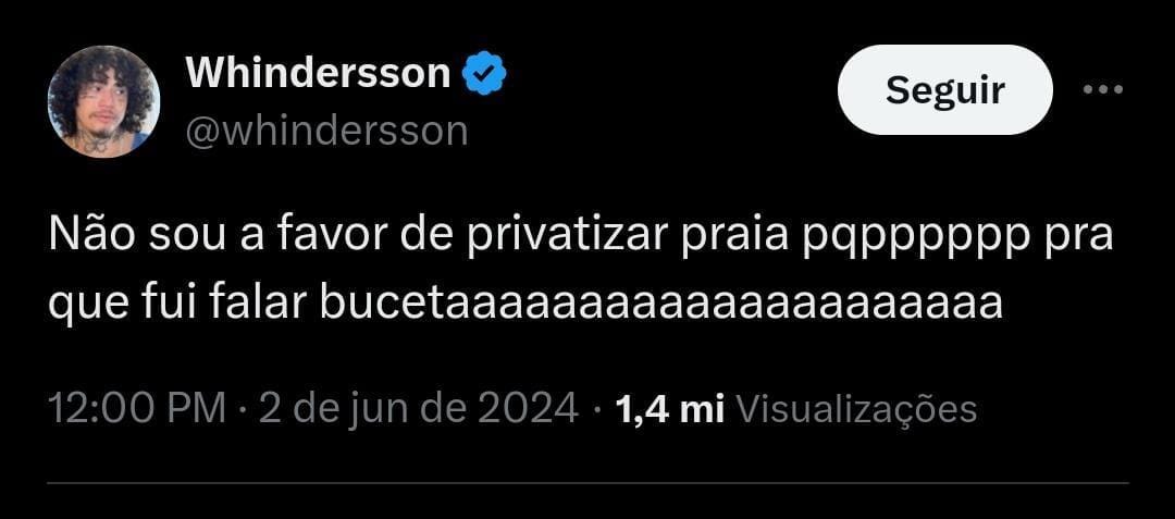 Neste domingo (2), Whindersson Nunes utilizou suas redes sociais para comentar a polêmica envolvendo Neymar, Defante e a PEC da "privatização" das praias. No X, antigo Twitter, o humorista defendeu Neymar, mas deixou claro que não apoia o projeto.