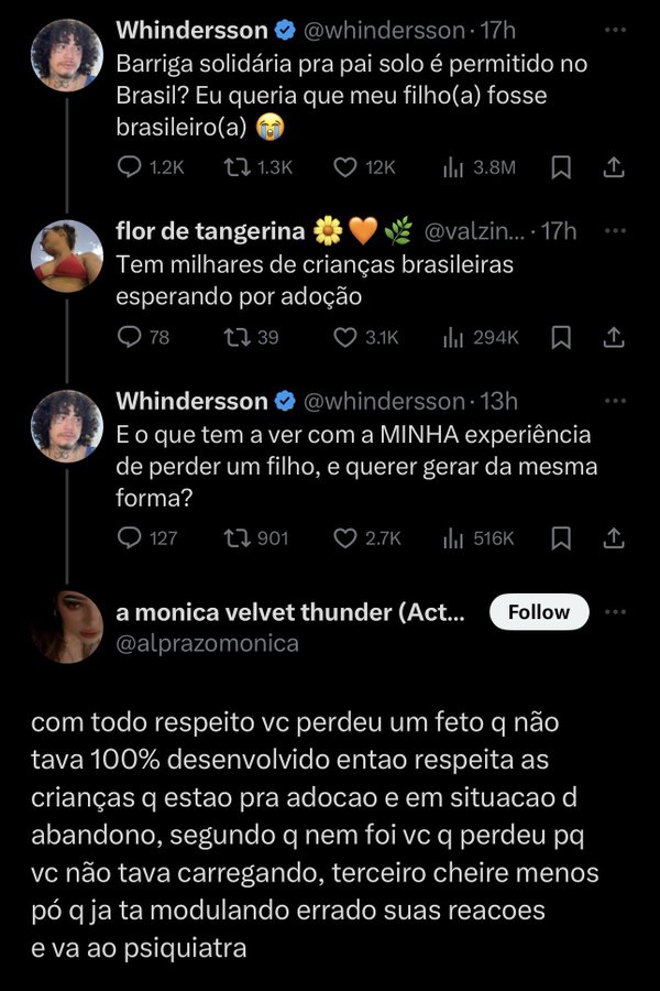 Whindersson passou a receber ataques de internautas após ter dito que gostaria de ter um filho de barriga solidária no Brasil. Alguns acusam o humorista de querer usar mulheres apenas como 'parideiras' e chegaram a fazer outras acusações, chegando a afirmar que ele 'acaba com a vida' de todas as mulheres que se relacionavam com ele.