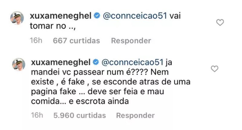 Indignada, Xuxa rebateu: “Vai tomar no … Já mandei você passear, não é? Nem existe, é fake. Se esconde atrás de uma página fake. Deve ser feia e mal comida... e escrota, ainda”, esbravejou.