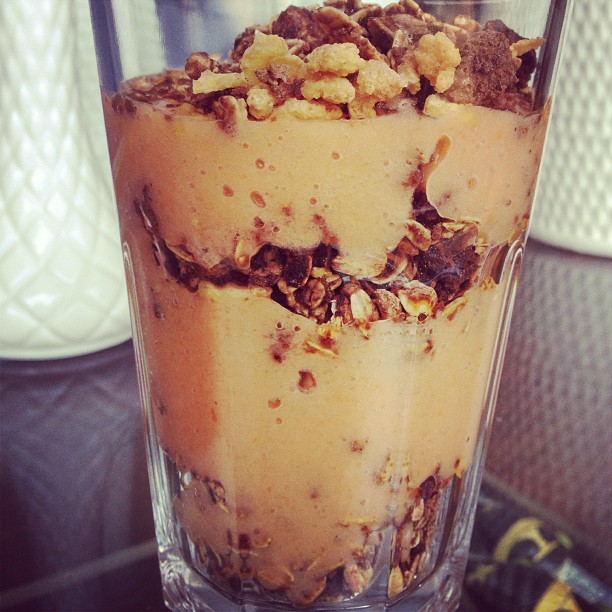 1 banana, 1 colher de sopa de cacau orgânico, 1 colher de sobremesa de canela, 1 colher de sopa de semente de chia, 1/2 colher de sopa de ativo de fibras, mel, leite de soja, gelo.Receita 4: