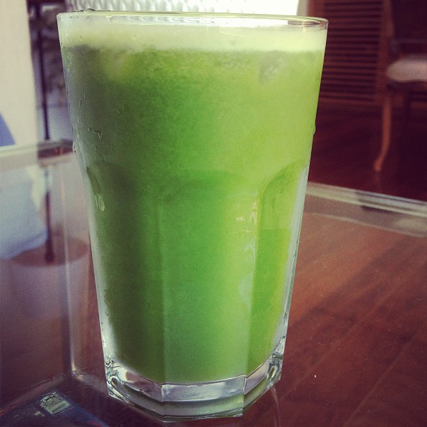 (na centrífuga) 2 folhes de couve, 1 pepino, um punhado de agrião, um punhado grande de hortelã, 2 maçãs verdes / (liquidificador) junte o suco verde com gelo, 4 rodelas de abacaxi e 1 banana