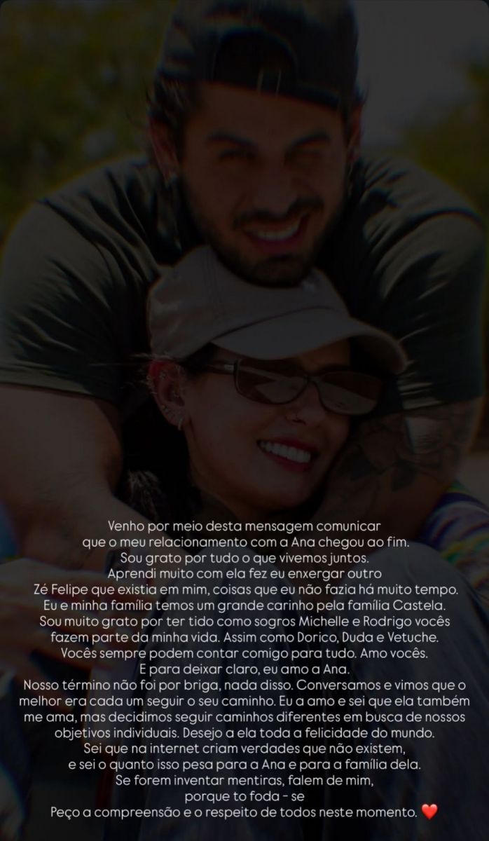 Ao finalizar, Zé Felipe reafirmou seu amor por Ana Castela e fez um apelo para que o público e a internet respeitem o momento, pedindo que não sejam criadas notícias falsas sobre o motivo da separação. "Peço a compreensão e o respeito de todos neste momento", concluiu.