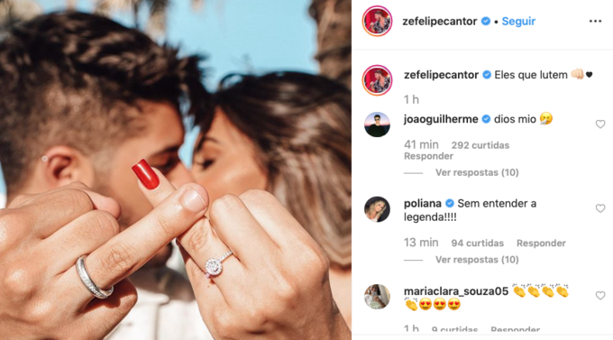 O cantor Zé Felipe e a namorada Isabella Arantes estão noivos! O casal fez o anúncio em suas redes sociais com uma foto bastante ousada: "Eles que lutem”, escreveu o artista na publicação.