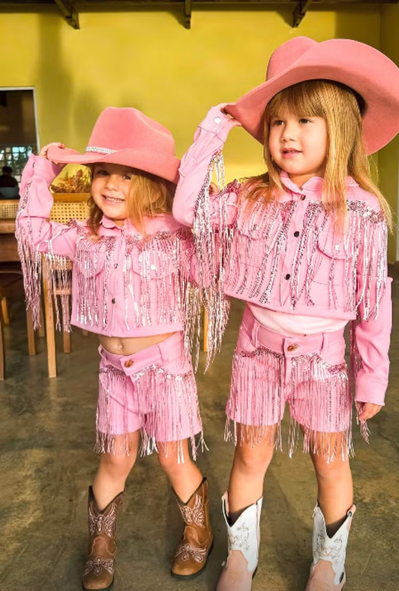 Com a música do casal ao fundo, as meninas surgiram com looks rosa, franjas brilhantes, chapéu de boiadeira e botas combinando, em clima sertanejo, no estilo "boiadeiras". As crianças passaram, junto com José Leonardo, de 1 ano, alguns dias na Fazenda Talismã, propriedade da família.