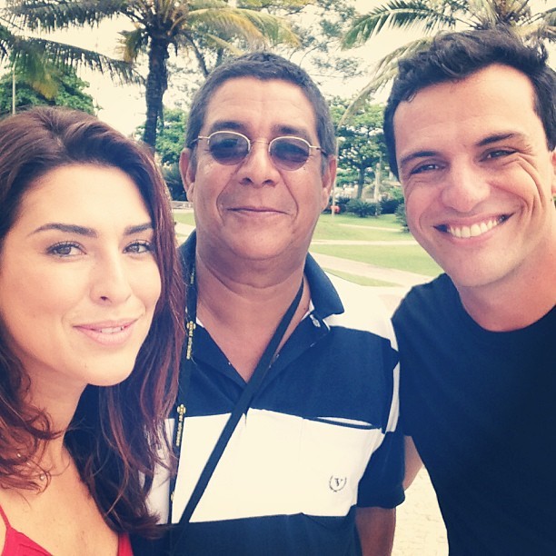 No dia do seu aniversário de 54 anos, nesta segunda-feira (04), Zeca Pagodinho tietou os atores da novela das nove, " Salve Jorge " e posou com o mais novo ' casal ' na trama, formado por Rodrigo Lombardi (que interpreta Théo ) e Fernanda Paes Leme ( Márcia ).