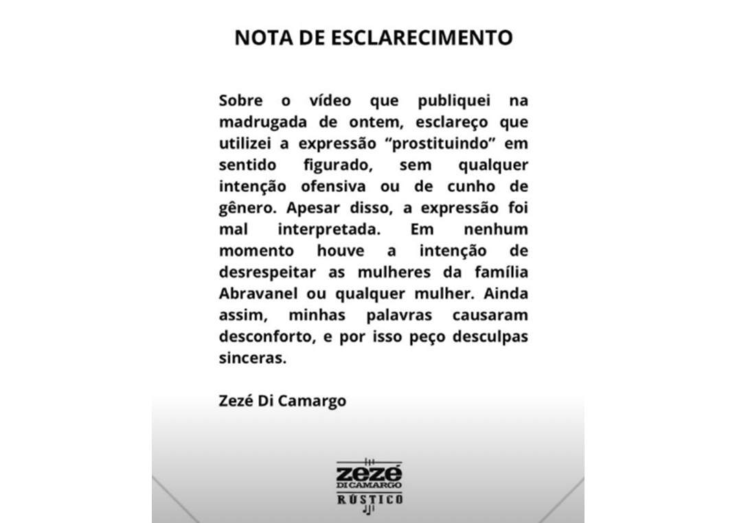 Após se manifestar publicamente sobre a participação do presidente Luiz Inácio Lula da Silva no programa especial de fim de ano do SBT, Zezé Di Camargo divulgou uma nota de esclarecimento pedindo desculpas pela expressão utilizada em sua fala. O cantor havia afirmado que a emissora estaria “se prostituindo” ao comentar a foto tirada por Patrícia Abravanel e Daniela Beyruti, filhas de Silvio Santos, ao lado do presidente durante a inauguração do SBT News.