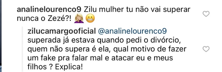 No Instagram, Zilu rebateu o comentário de uma internauta que escreveu: "Zilu mulher tu nunca vai superar o Zezé?!".
