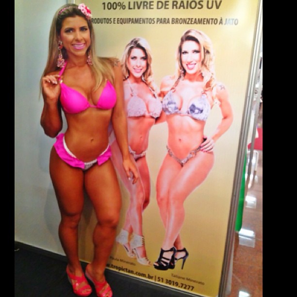 Só de biquíni, a loira divulgou a linha de bronzeadores da qual ela e sua irmã, Tatiane Minerato (musa da Gaviões da Fiel), são garotas-propaganda.