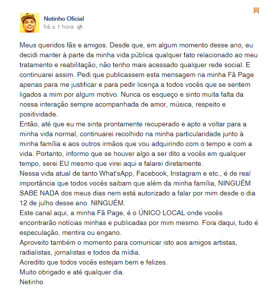 Pois bem, após os boatos Netinho reapareceu com um desabafo em sua página no Facebook.