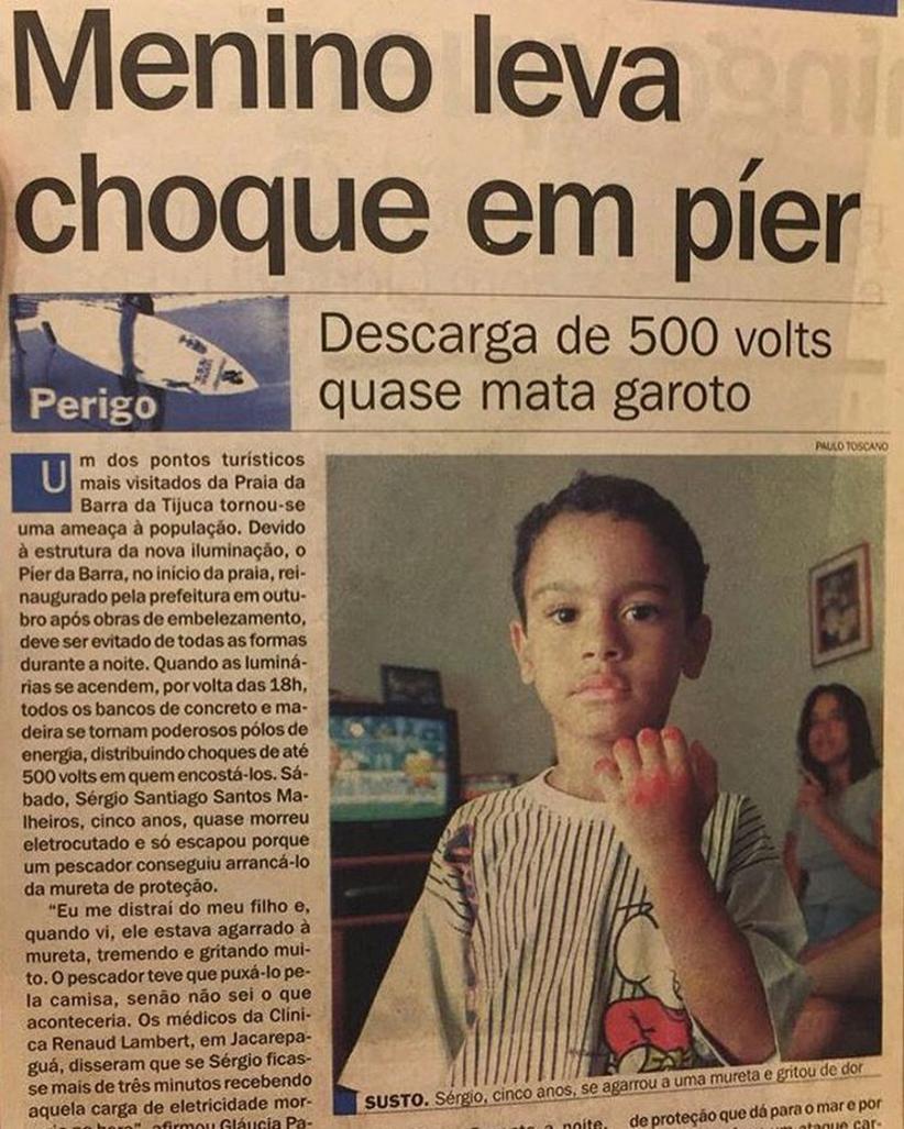 Nesta quinta-feira (19), Sérgio Malheiros compartilhou em seu Instagram um recorte do jornal em que aparece ainda criança, exibindo os ferimentos causados por um choque de 500 volts. No Pier da Barra, na praia da Barra da Tijuca, no Rio de Janeiro, em 1998.