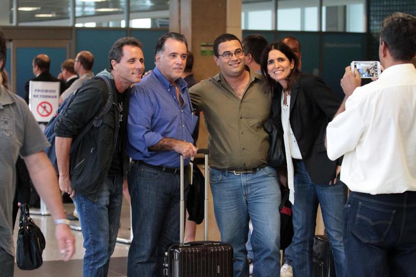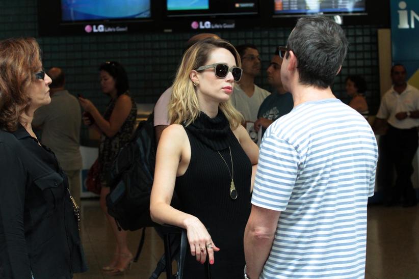 O músico recebeu a atriz com vários beijos. Malu chegou desembarcou no mesmo voo de Mariana Ximenes, Adriana Esteves e Tony Ramos.