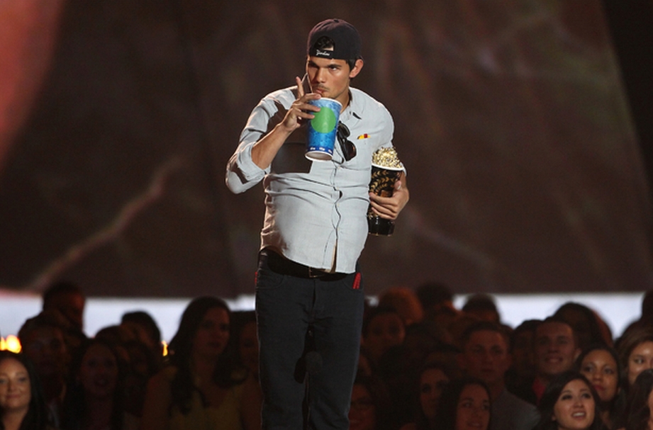 Taylor Lautner recebeu o prêmio de 'Melhor Performance Sem Camisa', graças ao seu 'tanquinho' em A Saga Crepúsculo. O ator arrancou risadas ao subir no palco tomando refrigerante, com uma barriga falsa enorme. Foto: Reprodução/Youtube