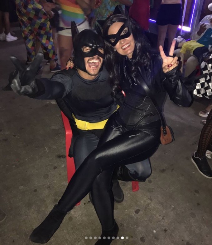 O advogado postou várias fotos da festa à fantasia em que esteve com a amada e a apresentadora revelou seu lado dominadora em um dos cliques em que aparece “amarrando” seu batman.