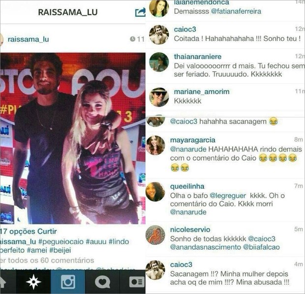 Mas para a surpresa da moça, não só o ator de "Amor à Vida" viu, como resolveu deixar um comentário negando tudo e ainda dando um corte "Coitada! Hahaahaha Sonho teu!", escreveu o intérprete do médico Michel. Alguns internautas ficaram com pena da garota e comentaram "Sacanagem, @caioc3". Logo o ator respondeu "Sacanagem?! Minha mulher depois acha o que de mim? Mina abusada!" disse.