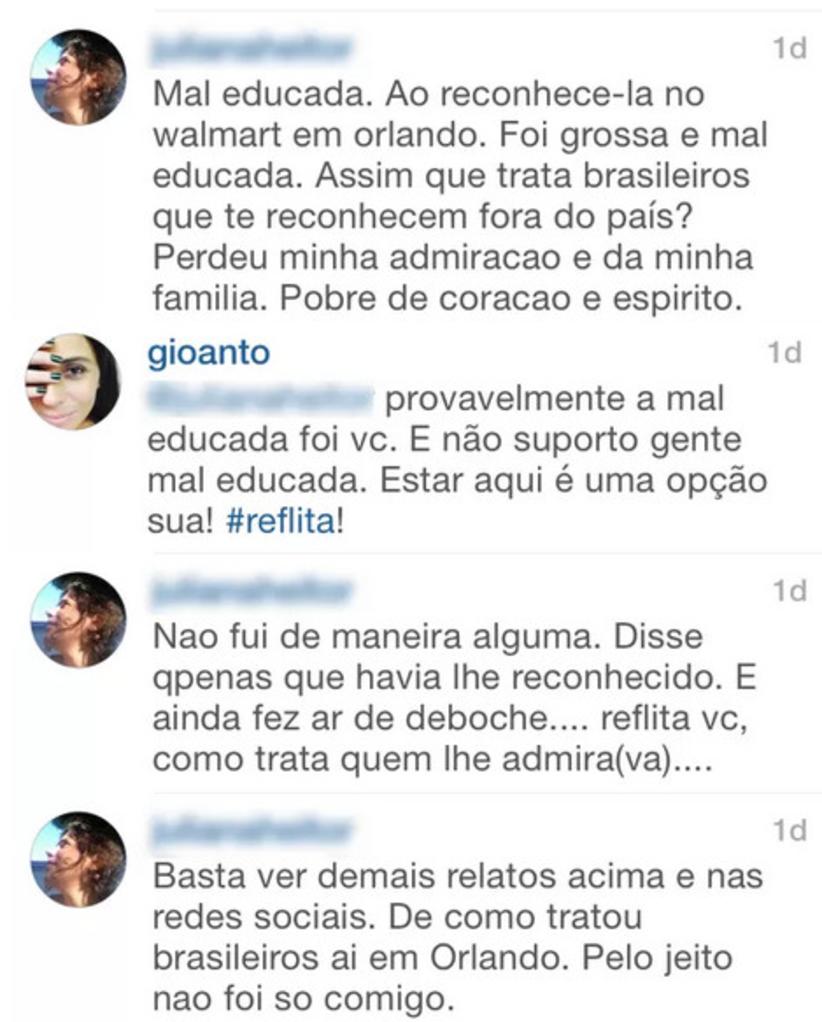 A seguidora retrucou: "Não fui (mal educada) de maneira nenhuma. Disse apenas que havia lhe reconhecido. E ainda fez ar de deboche... Reflita você como trata quem lhe admira(va). Basta ver demais relatos acima e nas redes sociais. De como tratou brasileiros aí em Orlando. Pelo jeito não foi só comigo".