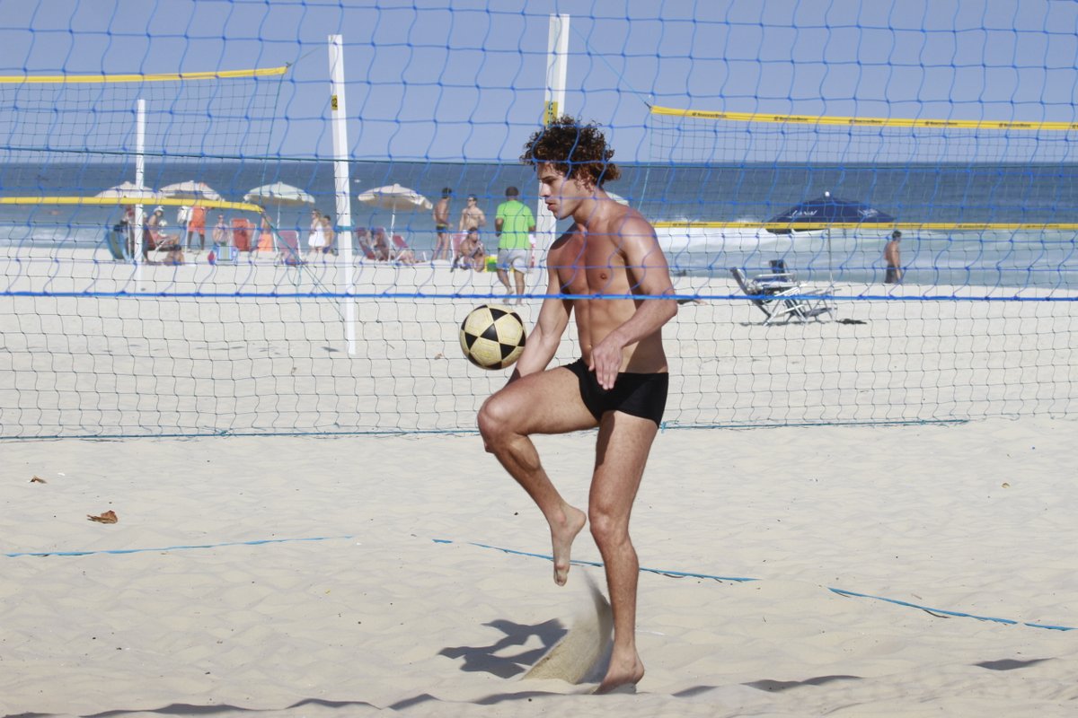 José Loreto resolveu fazer a alegria da mulherada e jogou futevôlei sem camisa, usando apenas a sunga de banho, durante a tarde desta sexta-feira ensolarada no Rio de Janeiro, na Praia da Barra da Tijuca.