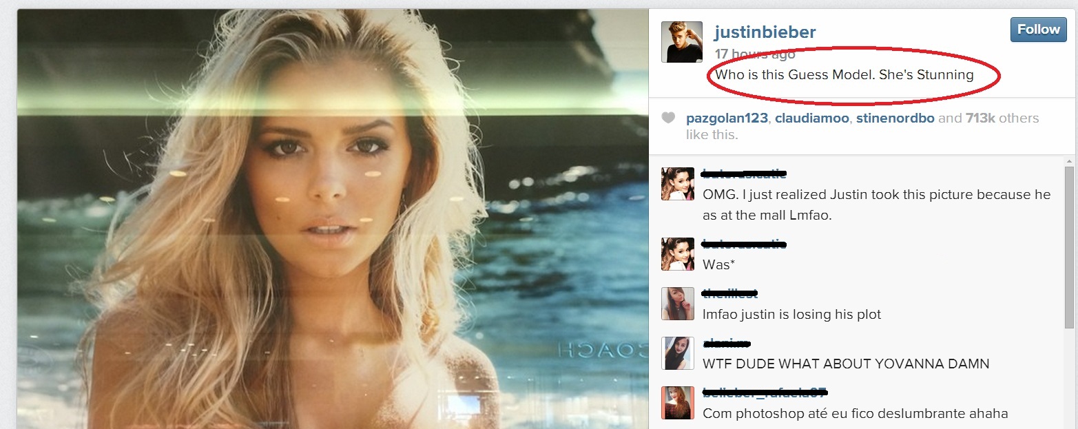 Agora, o astro teen parece estar à procura de uma nova beldade para sua coleção. O cantor estava circulando por aí quando se deparou com a foto de uma bela modelo loira aparentando ter sua faixa de idade, resolveu tirar a foto da imagem e fazer uma espécie de "correio do amor" no seu Instagram. "Quem é essa modelo da Guess? Ela é maravilhosa", escreveu.