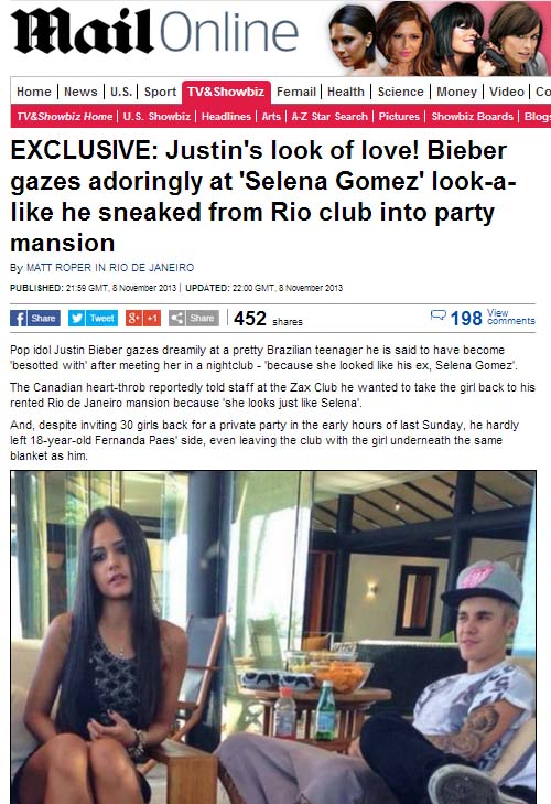 Após conhecer Fernanda Paes (18) em uma casa de show no Brasil e por revelar a funcionários da casa que estava “obcecado por ela, pois parecia com a Selena Gomez”. Na foto publicada pelo Daily, Justin aparece como que em outro mundo, talvez imaginando o quanto perdeu ao se separar da Selena americana.