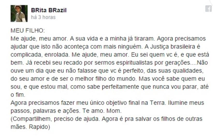 "Meu filho: me ajude, meu amor. A sua vida e a minha já tiraram. Agora precisamos ajudar para que isto não aconteça com mais ninguém. A Justiça brasileira é complicada, enrolada. Me ajude, meu amor. Eu sei quem você é, e que está bem. Já recebi seu recado por sermos espiritualistas por gerações....Não ouve um dia que eu não falasse que você é perfeito, das suas qualidades, do seu amor e de ser o melhor filho do mundo. Mas você sabe quem eu sou, e que estou mal, como sabe perfeitamente que nunca vou parar, até o fim. Agora precisamos fazer meu único objetivo final na Terra. Ilumine meus passos, palavras e ações. Te amo. Mom”, declarou.