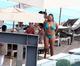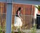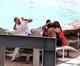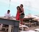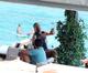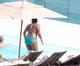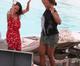 A atriz americana usou um biquíni comportado e se divertiu dançando com uma amiga.
