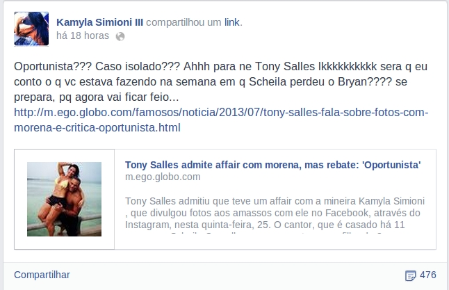 Parece que a poeira do barraco entre Tony Salles e sua amante não está abaixando. Kamyla Simioni, que revelou através de fotos no Facebook que é amante do cantor - e logo depois teve a história confirmada pelo próprio, que a chamou de oportunista e 'justificou' o ato através de um desabafo em rede social - resolveu colocar mais lenha na fogueira após se sentir ofendida.
