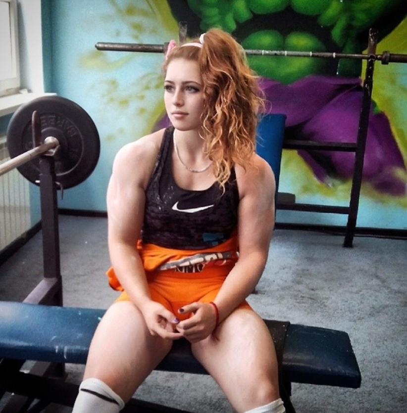 É que a mocinha nascida na Rússia é fisiculturista e levantadora de peso, e com 18 anos mostra que dá de 10 a 0 em muito marmanjo por aí no quesito ‘força’, e faz o maior sucesso por conta da sua excentricidade e determinação.
