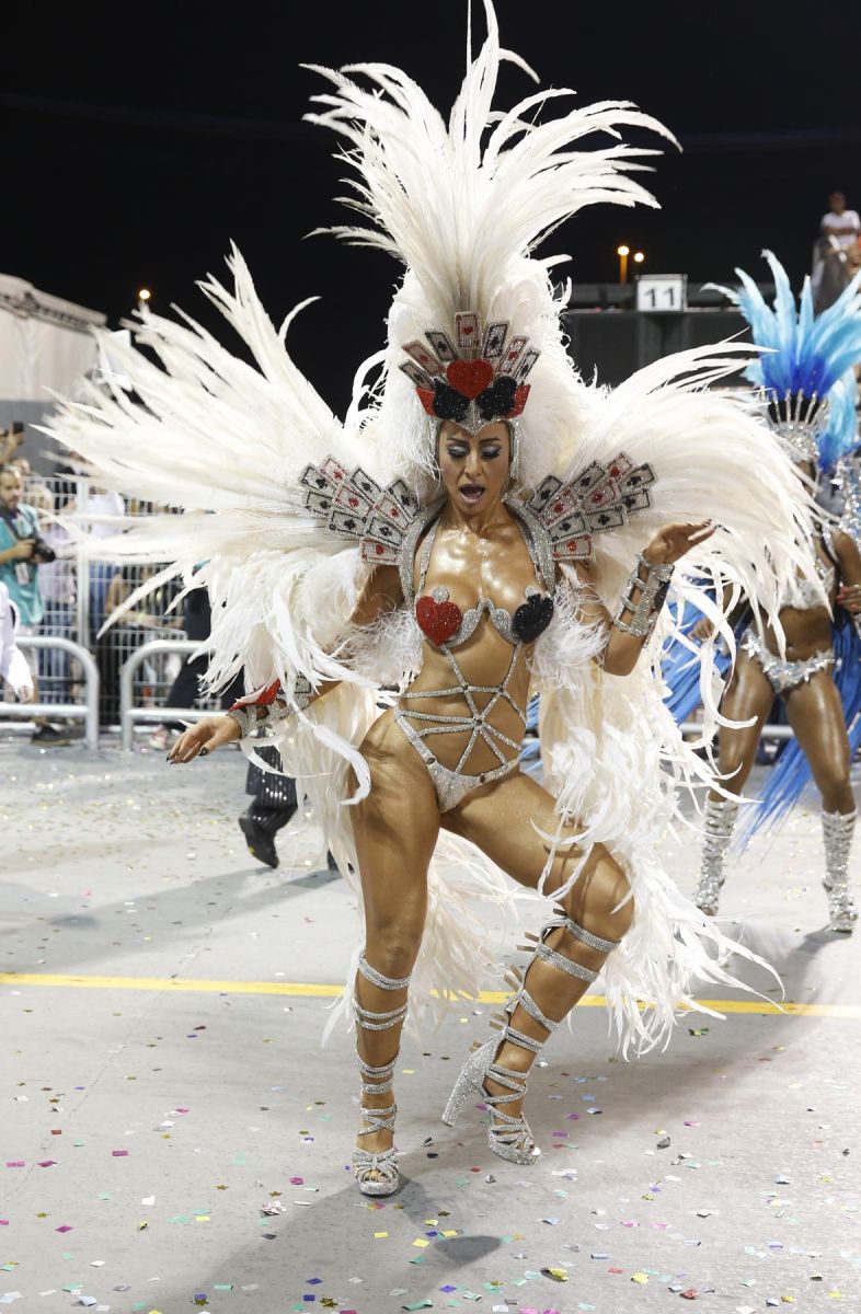 Pouco depois, ela revelou o look completo: uma fantasia dourada com decoração de cartas de baralho tanto nos peitos quanto na coroa. E diferente de outros anos, ela deixou o salto agulha e preferiu o tamanco para entrar na avenida.