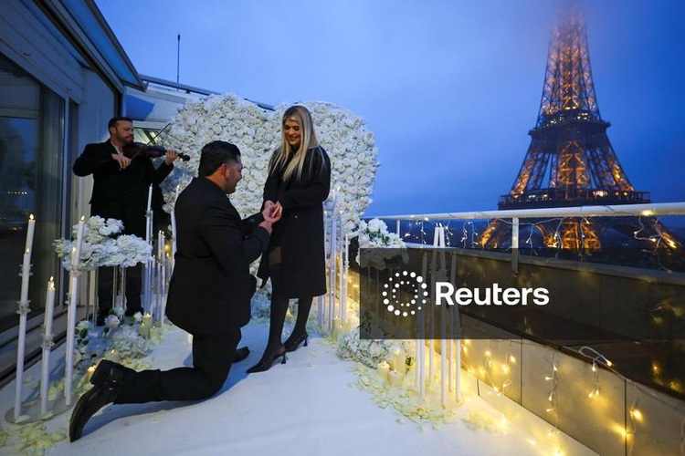 PARIS, 13 Fev (Reuters) - Quando o texano Josue Perales levou sua namorada Kayla Balboa para Paris, ela pensou que fosse apenas uma viagem romântica. Em vez disso, ele havia contratado uma agência especializada em pedidos de casamento para preparar um cenário de sonho com vista para a Torre Eiffel, repleto de rosas brancas e velas, para pedir a mão dela em casamento.