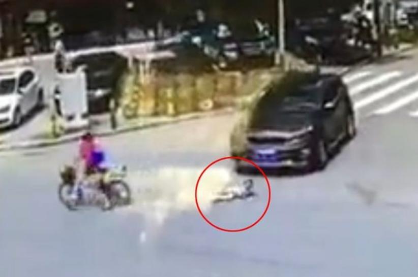 Imagens chocantes mostram o momento em que um carro atropelou uma criança após a ela cair da garupa de uma moto. A cena chocante foi filmada por câmeras de segurança em uma rua na China.