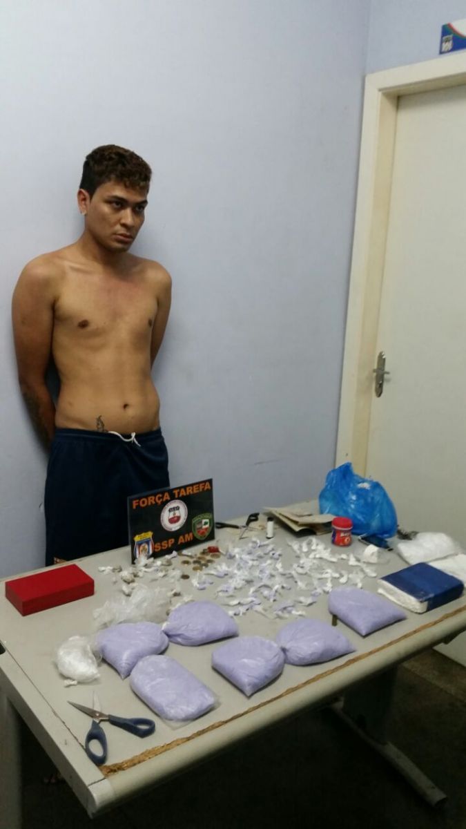 Thiago Cruz dos Santos 24 anos, vulgo "Jiujiteiro da Poeira", foi preso neste domingo, 04, na Avenida Nhamundá, Praça 14, com 06 porções grandes de Pasta Base de Cocaína (Aprox.6k), 01 Porção em Pedra de Cocaína (Aprox.1k), 19 Porção de Cocaína, 63 Porções de Pasta Base de Cocaína, 14 Porções de Skank, e apetrechos.