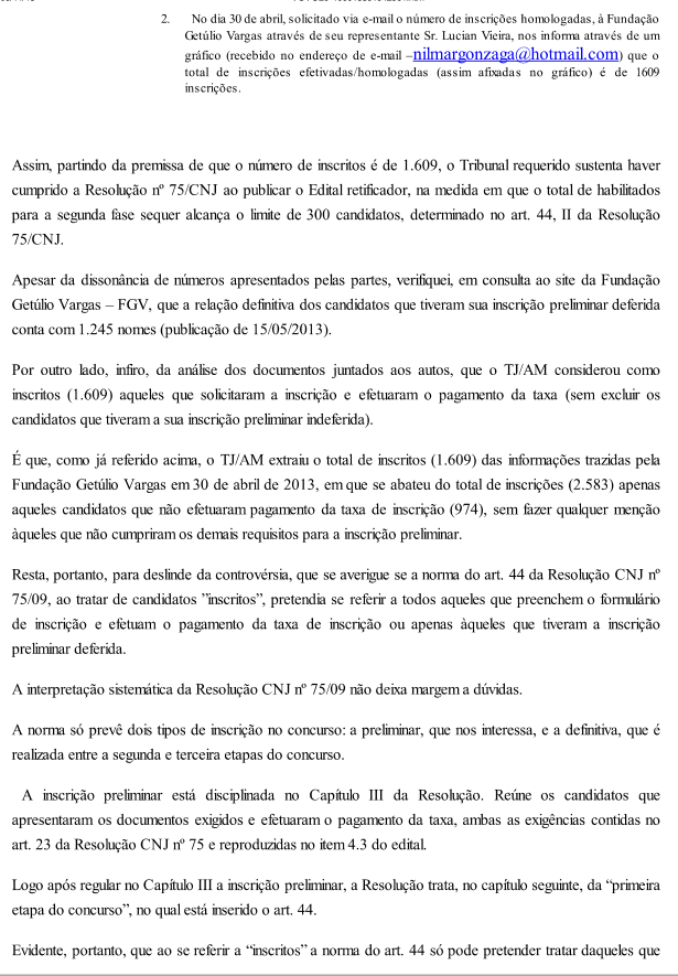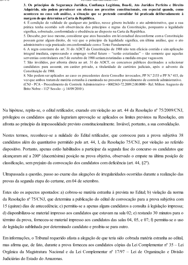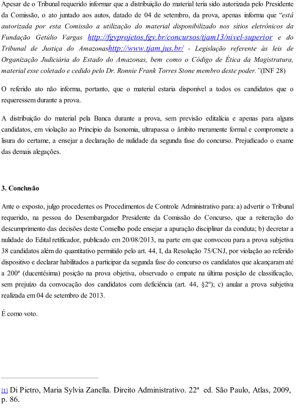 A conselheira Maria Cristina Irigoyen Peduzzi julgou procedentes os Procedimentos de Controle Administrativo impetrados por Jean Kissinger Barbalho da Cunha e Michel Alexandre da Silva Araújo, candidatos inscritos no concurso para o cargo de juiz de direito substituto do Tribunal de Justiça do Estado do Amazonas, e suspendeu o edital de retificação que convocou excessivamente 38 pessoas para a prova subjetiva.