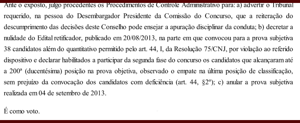 Maria Cristina anulou a prova subjetiva realizada no dia 04 de setembro deste ano. A conselheira ainda advertiu o presidente da Comissão do Concurso, desembargador Aristóteles Thury, que ao descumprir as decisões do Conselho poderá sofrer punição disciplinar.