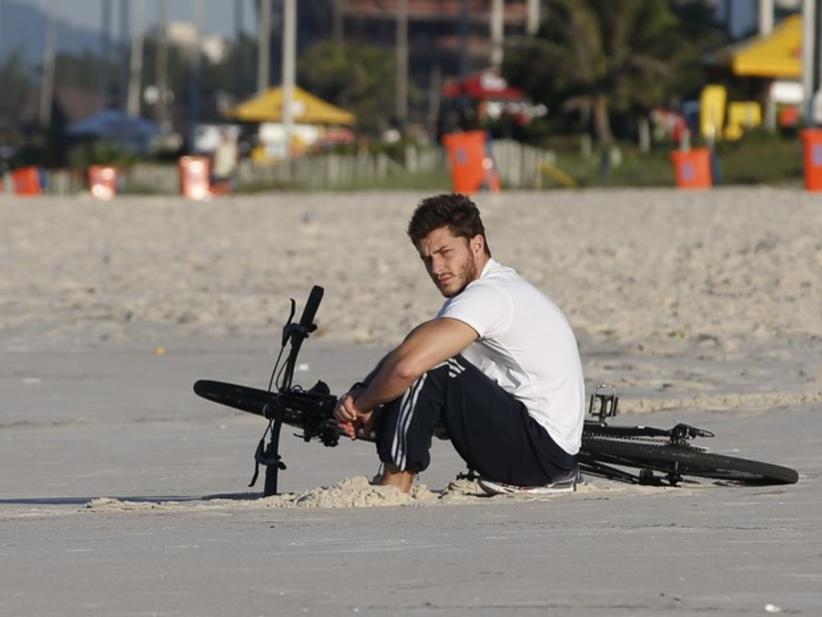 O ator chegou de bicicleta e permaneceu no local cabisbaixo. Apesar de não terem confirmado o fim do namoro, é evidente que os pombinhos não estão mais juntos.