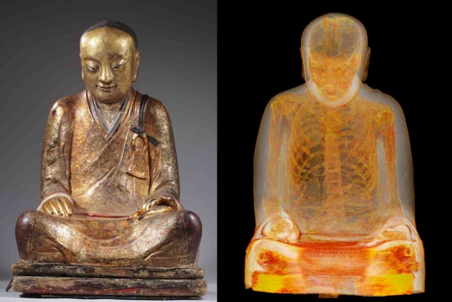 Exames realizados no Centro Médico de Meander, na Holanda, revelaram que uma estátua budista datada do século 11 ou 12 é bem mais do que uma “simples” escultura. Aparentemente sólida, a imagem guarda o corpo mumificado de um monge em posição de meditação – que ainda teve alguns dos órgãos trocados por papéis com inscritos em chinês.