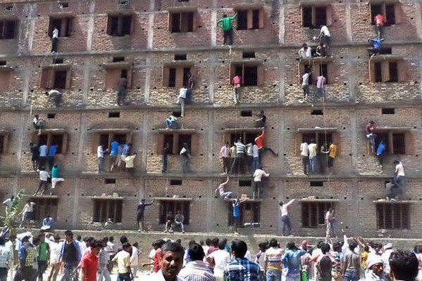 Familiares de estudantes são flagrados escalando o exterior de uma escola na Índia para passar cola aos alunos.