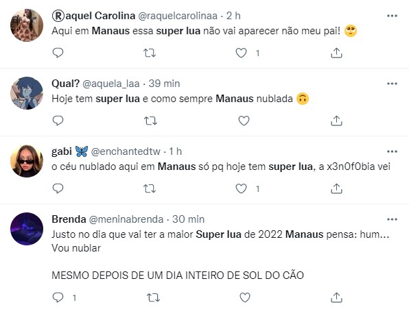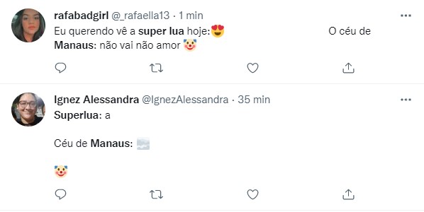 Entretanto, para visualizar a Superlua dos Cervos é necessário que o céu esteja limpo de nuvens, situação que não aconteceu em Manaus, onde ficou com o tempo nublado. Internautas comentaram no Twitter sobre a mudança repentina no clima da capital justo no dia do fenômeno.