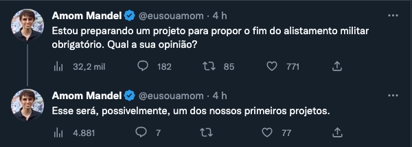 “Estou preparando um projeto para propor o fim do alistamento militar obrigatório. Qual a sua opinião?”, questionou Amom. “Esse será, possivelmente, um dos nossos primeiros projetos”, afirmou o deputado eleito.