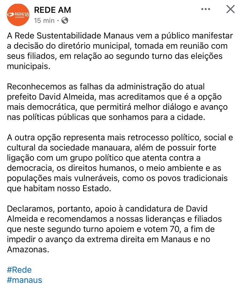 A REDE conclui com uma declaração de apoio a David Almeida, recomendando que as lideranças e filiados votem no candidato com o número 70, com o objetivo de impedir o avanço da extrema-direita em Manaus e no estado do Amazonas.