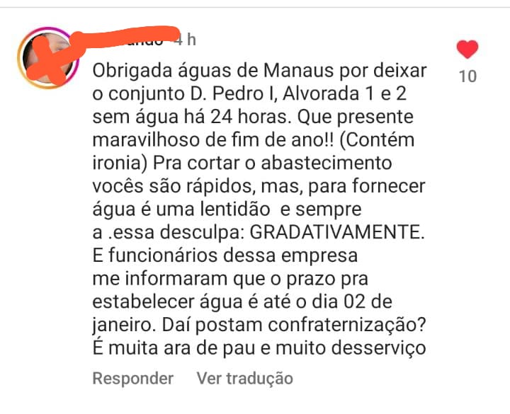 " A Águas de Manaus está atuando em uma manutenção emergencial para corrigir um vazamento na Avenida Pedro Teixeira. Em decorrência disso, o abastecimento de água pode apresentar oscilações nos bairros Dom Pedro e Alvorada. A previsão é que o serviço seja concluído na tarde deste domingo (31), com o abastecimento retomado de forma gradativa, na sequência".