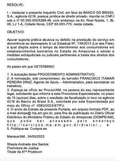 Manaus/AM - Três agências bancárias estão sendo investigadas pelo Ministério Público do Amazonas (MPAM) por conta do suposto descumprimento da Lei das Filas em Manaus. As agências que estão na mira do MP são dos bancos Itaú, Bradesco e Banco do Brasil.