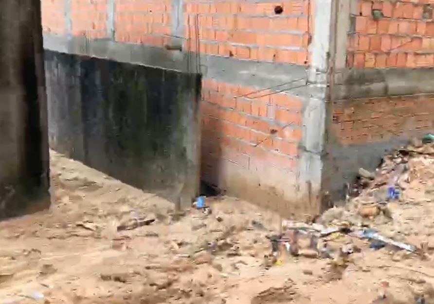 O barro só não invadiu completamente o local porque as paredes retiveram o material. Segundo os moradores, o barro é proveniente de uma obra inacabada realizada no terreno de que fica localizado atrás.