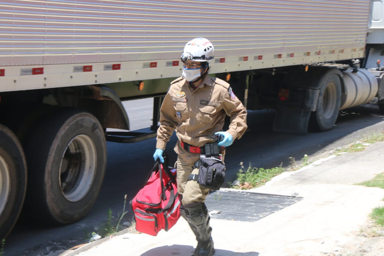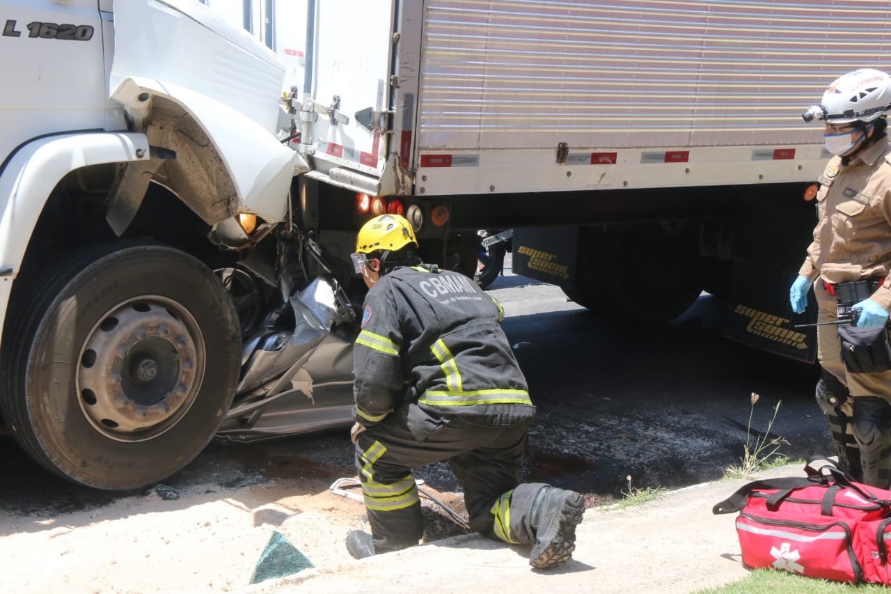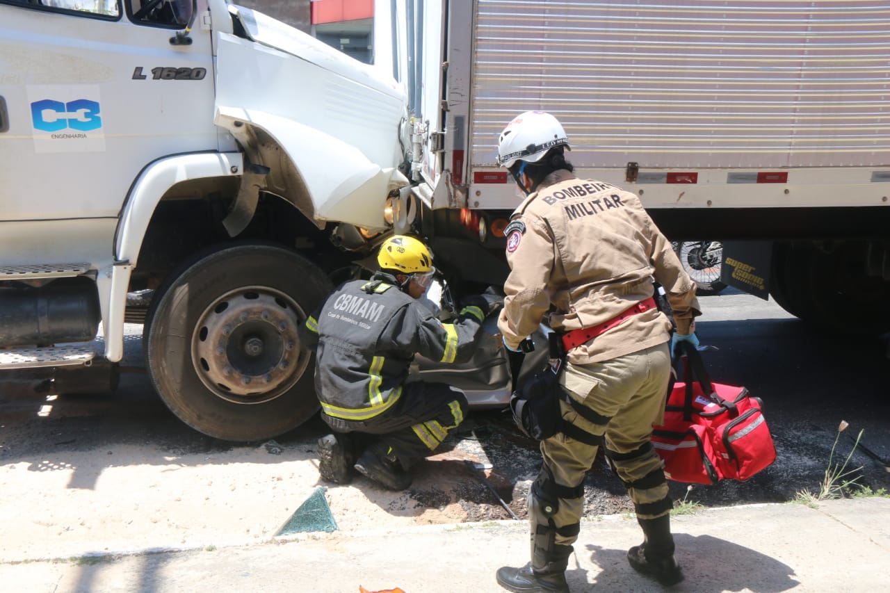 De acordo com o Corpo de Bombeiros, o carro foi esmagado após um caminhão que transportava areia bater na traseira do Honda que ficou preso entre outro caminhão.