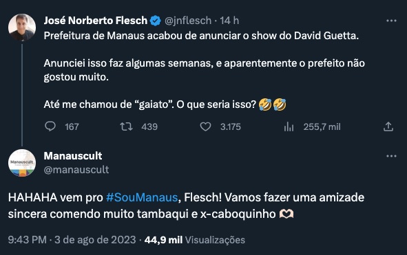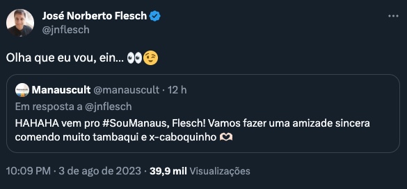 O perfil oficial da Prefeitura de Manaus respondeu o jornalista com um convite para o festival e para comer tambaqui e x-caboquinho na cidade. Flesch deixou no ar que pode ir.