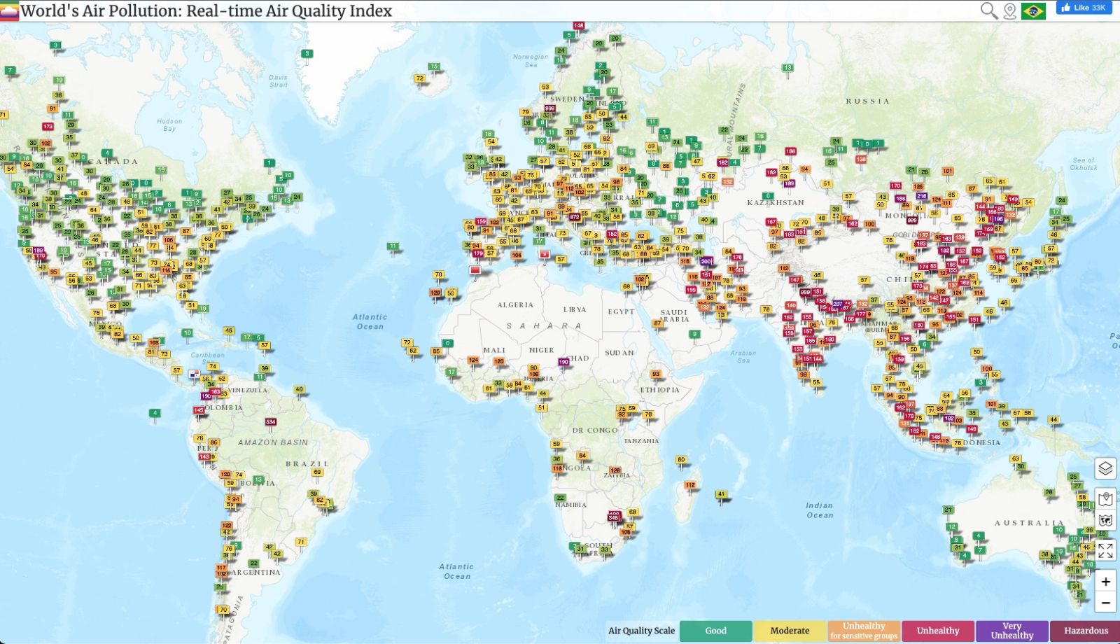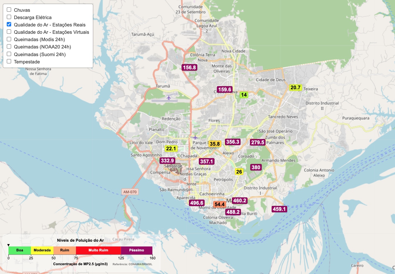 O sistema mostra que o ar em Manaus é um dos piores do mundo nesta quarta, com índice de poluição de quase 540 até às 9h. A capital amazonense só perde para Zenica Centar, na Bósnia, com poluição acima dos 800, Leiret, na Noruega e Umnogobi, na Mongólia, ambas com poluição no nível de 999.