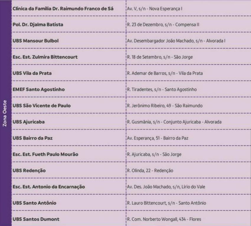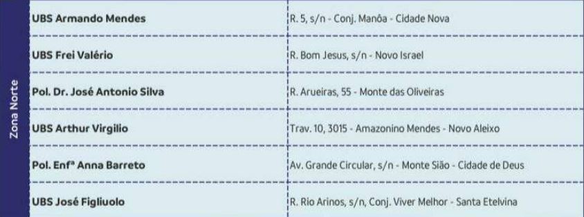 Cinco deles são fixos, como o Clube do Trabalhador do Sesi, na av. Cosme Ferreira, o Balneário do Sesc, no bairro Alvorada, o Centro Cultural Povos da Amazônia, no Crespo, a Universidade Paulista, em Flores, e o estacionamento do Supermercado Coema, na avenida Torquato Tapajós.