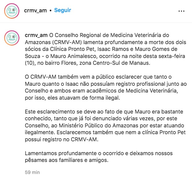 “ O CRMV-AM também vem a público esclarecer que tanto o Mauro quanto o Isaac não possuíam registro profissional junto ao Conselho e ambos eram acadêmicos de Medicina Veterinária, por isso, eles atuavam de forma ilegal.