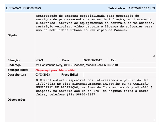 A empresa que for contratada vai prestar os serviços de processamento de autos de infração, monitoramento eletrônico através de controle de velocidade, restrição veicular, vídeo captura e licença de softwares para uso na mobilidade urbana de Manaus.