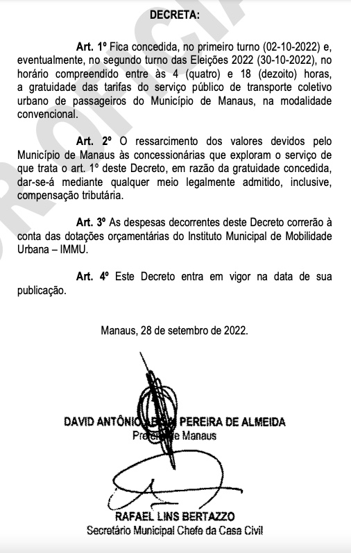 Manaus/AM - O prefeito de Manaus, David Almeida, sancionou o Projeto de Lei aprovado pela Câmara Municipal de Manaus (CMM), que trata da gratuidade das tarifas de ônibus no dia das eleições, neste domingo (2), quando será realizado o 1º turno. A gratuidade será garantida no horário das 4h da manhã até às 18h.